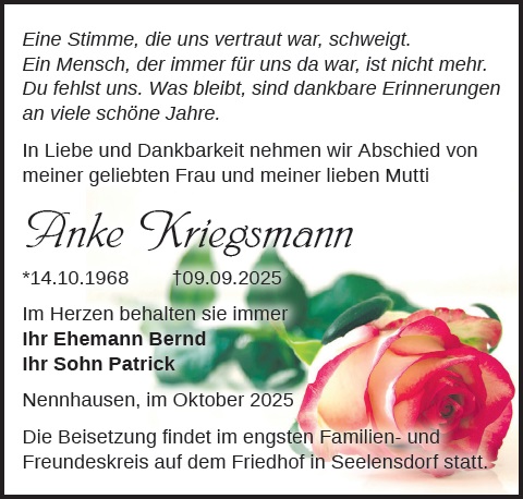 Zünden Sie eine Kerze für Anke Kriegsmann an und schreiben Sie Ihre ganz persönlichen Abschiedsworte.