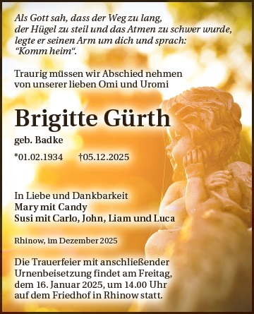 Liebe Familie, wir wünschen Ihnen von Herzen viel Kraft und Menschen in Ihrem Umfeld, die ihnen Halt geben in dieser Zeit. Sie können zusammen mit Ihren Lieben auf dieser Gedenkseite Erinnerungen teilen und so das Andenken an Brigitte Gürth gemeinsam erhalten. Ihr Bestattungshaus Schnee
