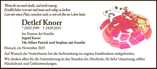 Zünden Sie eine Kerze für Detlef Knorr an und schreiben Sie Ihre ganz persönlichen Abschiedsworte.