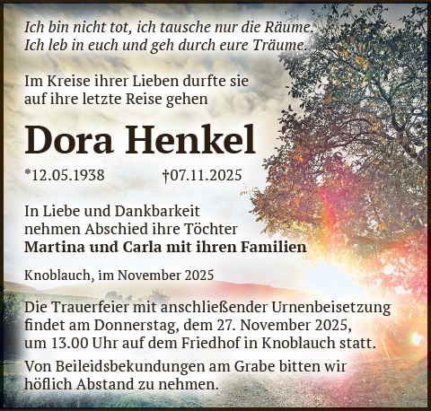 Zünden Sie eine Kerze für Dora Henkel an und schreiben Sie Ihre ganz persönlichen Abschiedsworte.