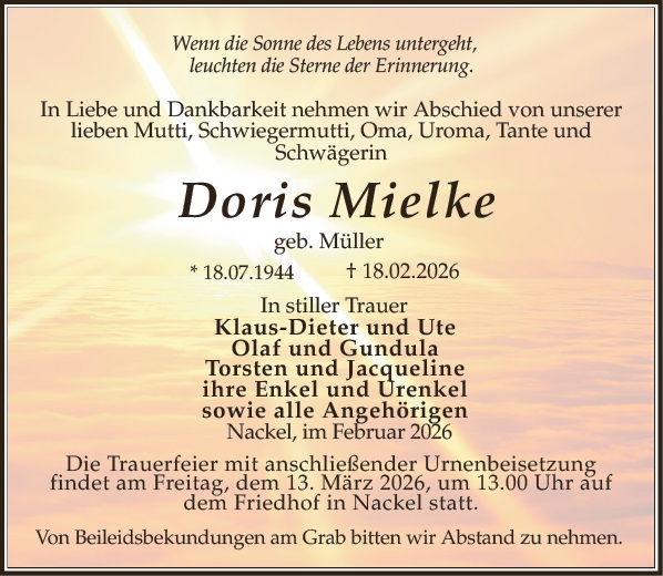 Zünden Sie eine Kerze für Doris Mielke an und schreiben Sie Ihre ganz persönlichen Abschiedsworte.