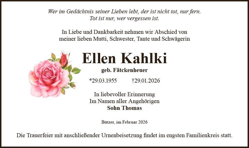Liebe Familie, wir wünschen Ihnen von Herzen viel Kraft und Menschen in Ihrem Umfeld, die ihnen Halt geben in dieser Zeit. Sie können zusammen mit Ihren Lieben auf dieser Gedenkseite Erinnerungen teilen und so das Andenken an Ellen Kahlki gemeinsam erhalten. Ihr Bestattungshaus Schnee