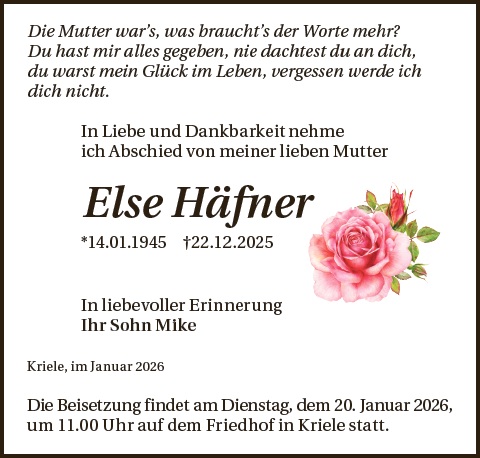 Liebe Familie, wir wünschen Ihnen von Herzen viel Kraft und Menschen in Ihrem Umfeld, die ihnen Halt geben in dieser Zeit. Sie können zusammen mit Ihren Lieben auf dieser Gedenkseite Erinnerungen teilen und so das Andenken an Else Häfner gemeinsam erhalten. Ihr Bestattungshaus Schnee