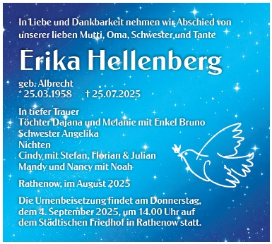 Zünden Sie eine Kerze für Erika Hellenberg an und schreiben Sie Ihre ganz persönlichen Abschiedsworte.