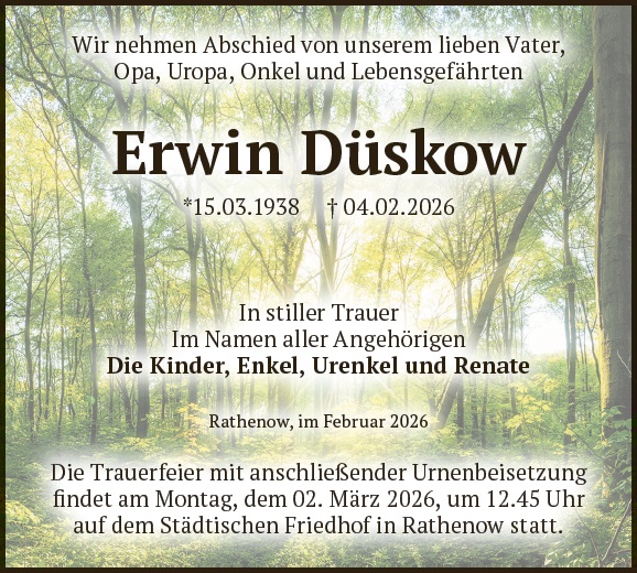 Liebe Familie, wir wünschen Ihnen von Herzen viel Kraft und Menschen in Ihrem Umfeld, die ihnen Halt geben in dieser Zeit. Sie können zusammen mit Ihren Lieben auf dieser Gedenkseite Erinnerungen teilen und so das Andenken an Erwin Düskow gemeinsam erhalten. Ihr Bestattungshaus Schnee