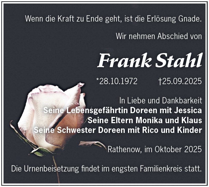 Zünden Sie eine Kerze für Frank Stahl an und schreiben Sie Ihre ganz persönlichen Abschiedsworte.