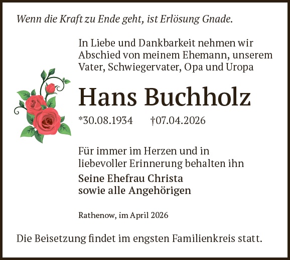 Liebe Familie, wir wünschen Ihnen von Herzen viel Kraft und Menschen in Ihrem Umfeld, die ihnen Halt geben in dieser Zeit. Sie können zusammen mit Ihren Lieben auf dieser Gedenkseite Erinnerungen teilen und so das Andenken an Hans Buchholz gemeinsam erhalten. Ihr Bestattungshaus Schnee