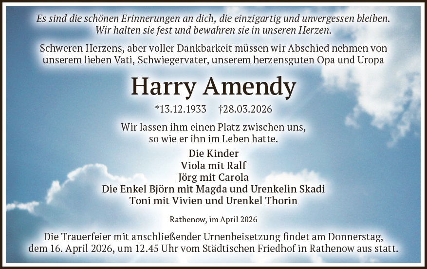 Liebe Familie, wir wünschen Ihnen von Herzen viel Kraft und Menschen in Ihrem Umfeld, die ihnen Halt geben in dieser Zeit. Sie können zusammen mit Ihren Lieben auf dieser Gedenkseite Erinnerungen teilen und so das Andenken an Harry Amendy gemeinsam erhalten. Ihr Bestattungshaus Schnee