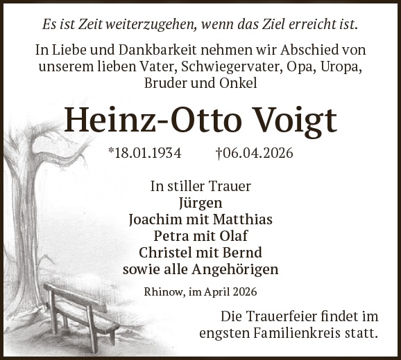 Liebe Familie, wir wünschen Ihnen von Herzen viel Kraft und Menschen in Ihrem Umfeld, die ihnen Halt geben in dieser Zeit. Sie können zusammen mit Ihren Lieben auf dieser Gedenkseite Erinnerungen teilen und so das Andenken an Heinz-Otto Voigt gemeinsam erhalten. Ihr Bestattungshaus Schnee