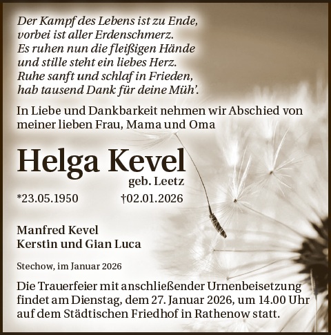 Zünden Sie eine Kerze für Helga Kevel an und schreiben Sie Ihre ganz persönlichen Abschiedsworte.