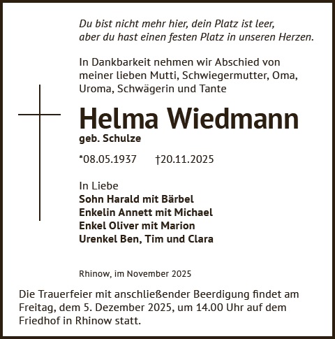 Zünden Sie eine Kerze für Helma Wiedmann an und schreiben Sie Ihre ganz persönlichen Abschiedsworte.