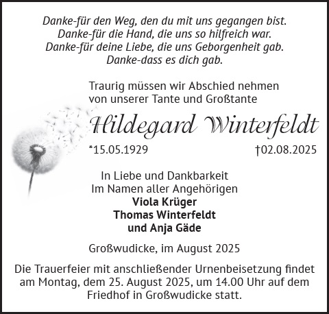 Sie können zusammen mit Ihren Lieben auf dieser Gedenkseite Erinnerungen teilen und so das Andenken an Hildegard Winterfeldt gemeinsam erhalten.
