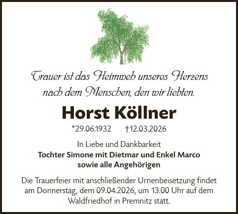 Liebe Familie, wir wünschen Ihnen von Herzen viel Kraft und Menschen in Ihrem Umfeld, die ihnen Halt geben in dieser Zeit. Sie können zusammen mit Ihren Lieben auf dieser Gedenkseite Erinnerungen teilen und so das Andenken an Horst Köllner gemeinsam erhalten. Ihr Bestattungshaus Schnee