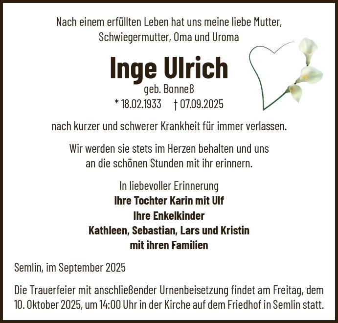 Sie können zusammen mit Ihren Lieben auf dieser Gedenkseite Erinnerungen teilen und so das Andenken an Inge Ulrich gemeinsam erhalten.