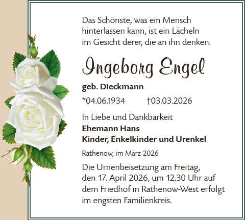 Liebe Familie, wir wünschen Ihnen von Herzen viel Kraft und Menschen in Ihrem Umfeld, die ihnen Halt geben in dieser Zeit. Sie können zusammen mit Ihren Lieben auf dieser Gedenkseite Erinnerungen teilen und so das Andenken an Ingeborg Engel gemeinsam erhalten. Ihr Bestattungshaus Schnee