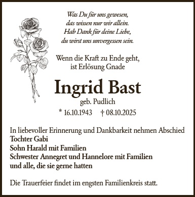 Zünden Sie eine Kerze für Ingrid Bast an und schreiben Sie Ihre ganz persönlichen Abschiedsworte.