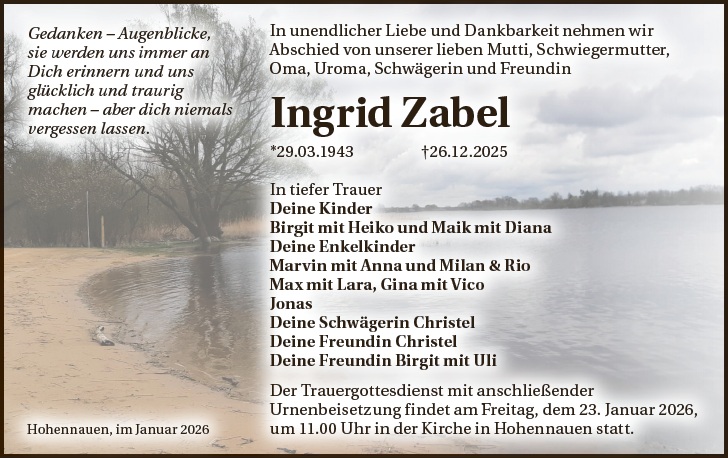 Liebe Familie, wir wünschen Ihnen von Herzen viel Kraft und Menschen in Ihrem Umfeld, die ihnen Halt geben in dieser Zeit. Sie können zusammen mit Ihren Lieben auf dieser Gedenkseite Erinnerungen teilen und so das Andenken an Ingrid Zabel gemeinsam erhalten. Ihr Bestattungshaus Schnee