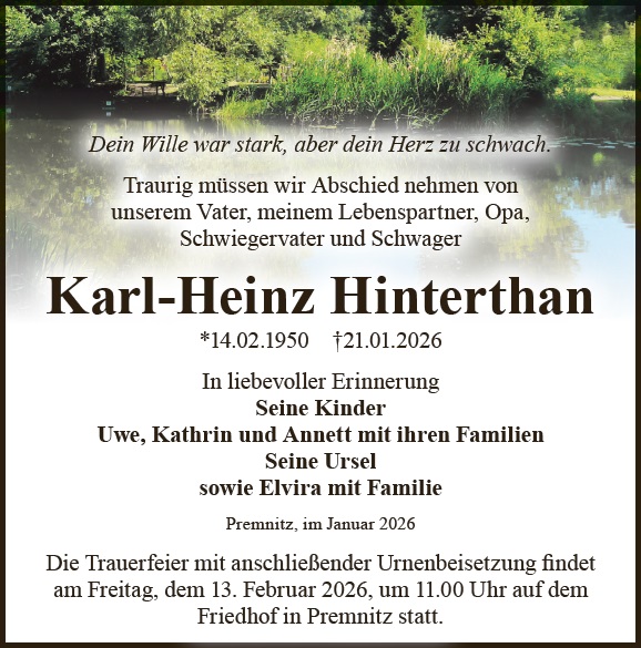 Liebe Familie, wir wünschen Ihnen von Herzen viel Kraft und Menschen in Ihrem Umfeld, die ihnen Halt geben in dieser Zeit. Sie können zusammen mit Ihren Lieben auf dieser Gedenkseite Erinnerungen teilen und so das Andenken an Karl-Heinz Hinterthan gemeinsam erhalten. Ihr Bestattungshaus Schnee