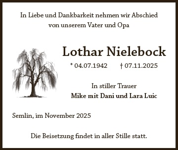 Liebe Familie, wir wünschen Ihnen von Herzen viel Kraft und Menschen in Ihrem Umfeld, die ihnen Halt geben in dieser Zeit. Sie können zusammen mit Ihren Lieben auf dieser Gedenkseite Erinnerungen teilen und so das Andenken an Lothar Nielebock gemeinsam erhalten. Ihr Bestattungshaus Schnee