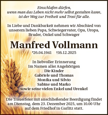 Liebe Familie, wir wünschen Ihnen von Herzen viel Kraft und Menschen in Ihrem Umfeld, die ihnen Halt geben in dieser Zeit. Sie können zusammen mit Ihren Lieben auf dieser Gedenkseite Erinnerungen teilen und so das Andenken an Manfred Vollmann gemeinsam erhalten. Ihr Bestattungshaus Schnee