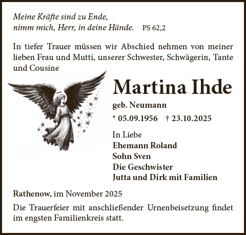 Liebe Familie, wir wünschen Ihnen von Herzen viel Kraft und Menschen in Ihrem Umfeld, die ihnen Halt geben in dieser Zeit. Sie können zusammen mit Ihren Lieben auf dieser Gedenkseite Erinnerungen teilen und so das Andenken an Martina Ihde gemeinsam erhalten. Ihr Bestattungshaus Schnee