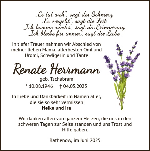 Liebe Familie, wir wünschen Ihnen von Herzen viel Kraft und Menschen in Ihrem Umfeld, die ihnen Halt geben in dieser Zeit. Sie können zusammen mit Ihren Lieben auf dieser Gedenkseite Erinnerungen teilen und so das Andenken an Renate Herrmann gemeinsam erhalten. Ihr Bestattungshaus Schnee