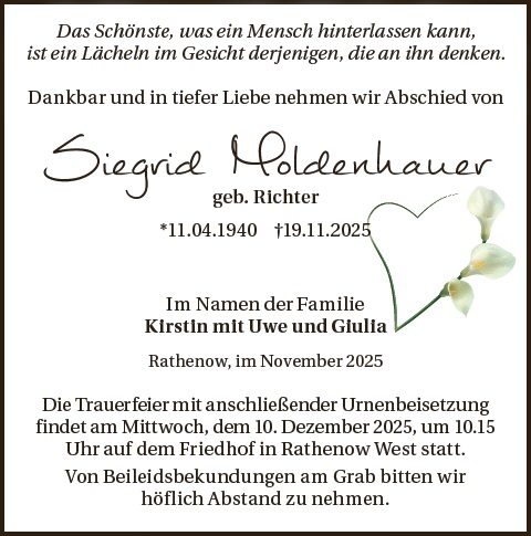 Liebe Familie, wir wünschen Ihnen von Herzen viel Kraft und Menschen in Ihrem Umfeld, die ihnen Halt geben in dieser Zeit. Sie können zusammen mit Ihren Lieben auf dieser Gedenkseite Erinnerungen teilen und so das Andenken an Siegrid Moldenhauer gemeinsam erhalten. Ihr Bestattungshaus Schnee