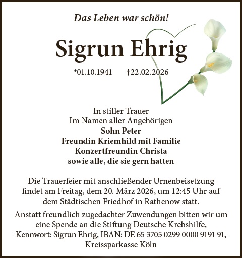 Liebe Familie, wir wünschen Ihnen von Herzen viel Kraft und Menschen in Ihrem Umfeld, die ihnen Halt geben in dieser Zeit. Sie können zusammen mit Ihren Lieben auf dieser Gedenkseite Erinnerungen teilen und so das Andenken an Sigrun Ehrig gemeinsam erhalten. Ihr Bestattungshaus Schnee