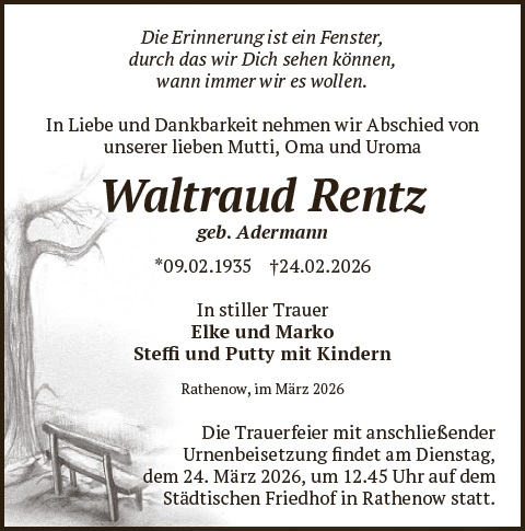 Zünden Sie eine Kerze für Waltraud Rentz an und schreiben Sie Ihre ganz persönlichen Abschiedsworte.