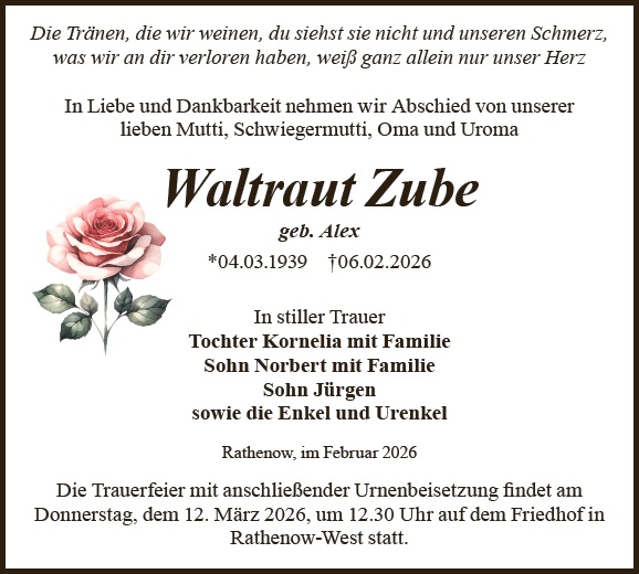 Liebe Familie, wir wünschen Ihnen von Herzen viel Kraft und Menschen in Ihrem Umfeld, die ihnen Halt geben in dieser Zeit. Sie können zusammen mit Ihren Lieben auf dieser Gedenkseite Erinnerungen teilen und so das Andenken an Waltraut Zube gemeinsam erhalten. Ihr Bestattungshaus Schnee