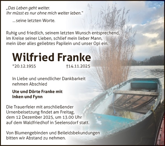 Liebe Familie, wir wünschen Ihnen von Herzen viel Kraft und Menschen in Ihrem Umfeld, die ihnen Halt geben in dieser Zeit. Sie können zusammen mit Ihren Lieben auf dieser Gedenkseite Erinnerungen teilen und so das Andenken an Wilfried Franke gemeinsam erhalten. Ihr Bestattungshaus Schnee
