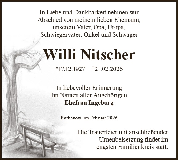 Zünden Sie eine Kerze für Willi Nitscher an und schreiben Sie Ihre ganz persönlichen Abschiedsworte.